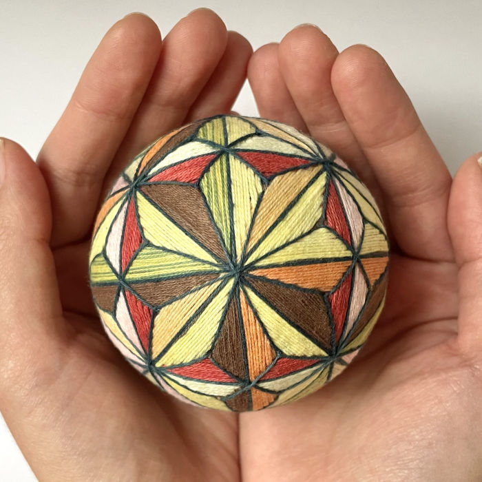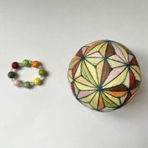This is a traditional Japanese craft called a “Temari” ball. Temari are made by winding long threads into a perfect sphere and are considered lucky charms symbolizing the wish “May you live happily and peacefully for a long time.”