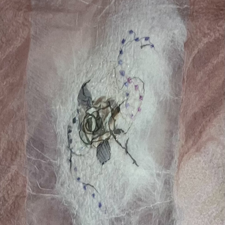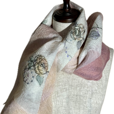 This piece is a hand-painted work in which an abstract rose pattern is drawn in a single stroke with ink. Thin silk fabric dyed in soft colors is sandwiched between transparent organza and merino wool, then fulled to create the finished piece.