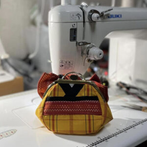 The main body of the clasp pouch is made from leftover kimono fabric — specifically, pure silk Kihachijō, one of Japan’s three great types of tsumugi (hand-woven silk fabric).The obi-style decorative ribbon is made from leftover pure silk tsumugi fabric. Other small parts are made of cotton.