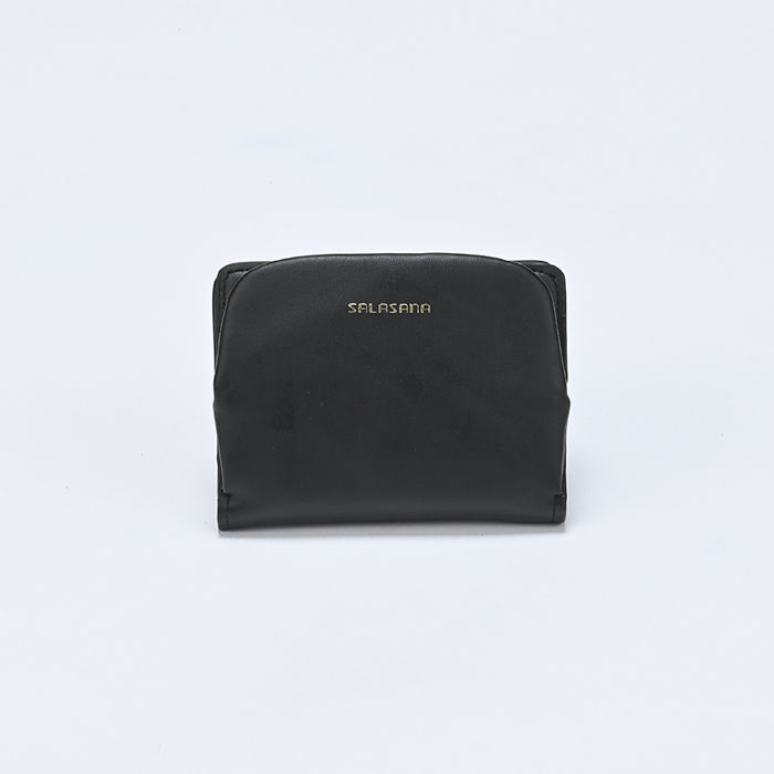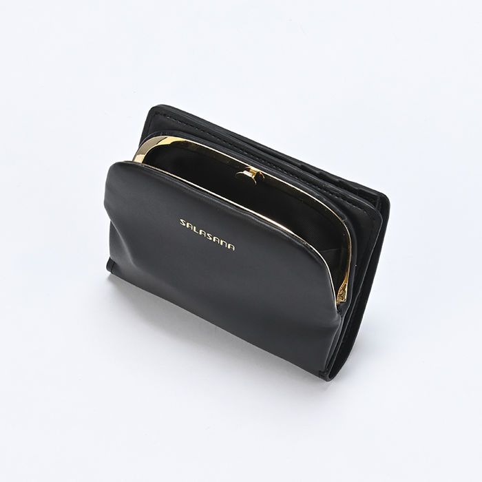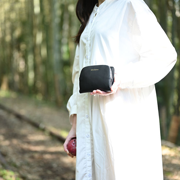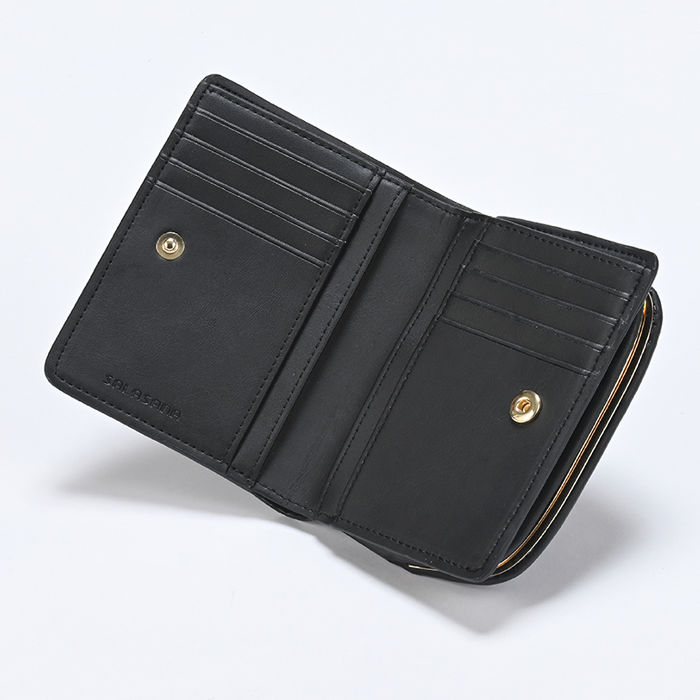 A button clasp closure bi-fold wallet. This item includes a coin purse with a separate convenient clasp closure. It is perfect for those who need both compactness and storage capacity, and its design can be enjoyed by both men and women. Made of “Apple Leather”(a sustainable leather alternative derived from discarded apples). Apple leather is a lightweight, durable, environmentally friendly and sustainable material. The coin purse, bills, and card sections are separate, making it easy to store in a small bag. The subtle metallic-stamped logo makes this everyday accessory even more luxurious. The compact form features multiple storage spaces, including eight card slots and four free pockets. It also opens up easily for coins, and has been designed for ease of use down to the last detail.