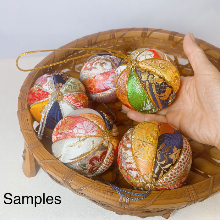 This is a set of 5 vibrant hanging balls crafted from colorful brocade (kinran) fabric. Kinran is a traditional Japanese textile often used for doll costumes, known for its rich colors and luxurious appearance. Each ball is divided into eight sections, with a different fabric on each surface, creating an ornate and elegant look. Every piece is carefully handmade. With a diameter of about 8 cm(3.1 inches), they have a striking presence when displayed.