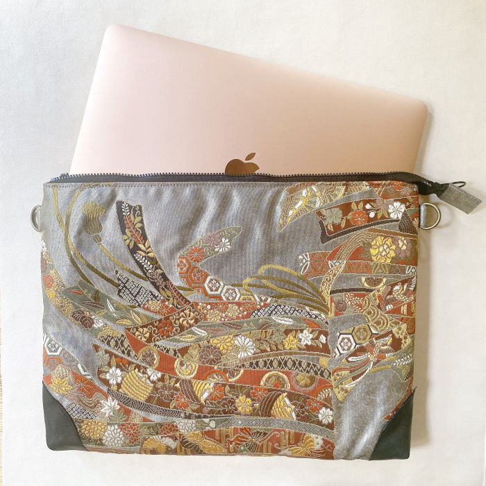 This laptop bag is made from a silk fukuro-obi, a formal type of Japanese kimono sash.