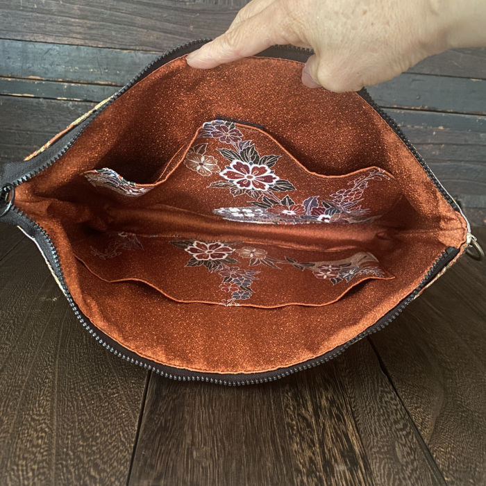 The bag is designed to fit a small laptop (approximately 13-inch). Its zipper is a ring-style type, extended for smooth and easy opening and closing, ensuring convenient access. The interior is padded with a layer of urethane to provide cushioning and protect your laptop during use. Inside, there are two pockets: one larger pocket and another divided in the center, ideal for organizing smaller items. The corners are reinforced with genuine black leather, which prevents wear while adding a stylish accent. The lining is crafted from formal silk kimono fabric (homongi), giving the interior a touch of luxury and refinement. Please note that no strap is included.
