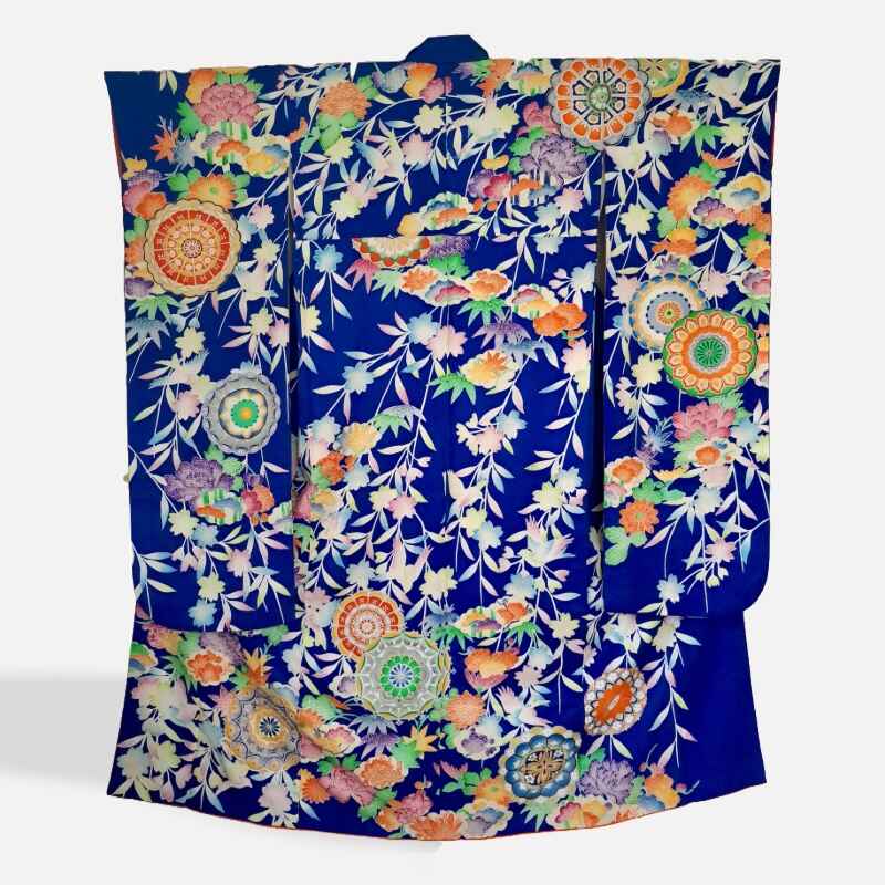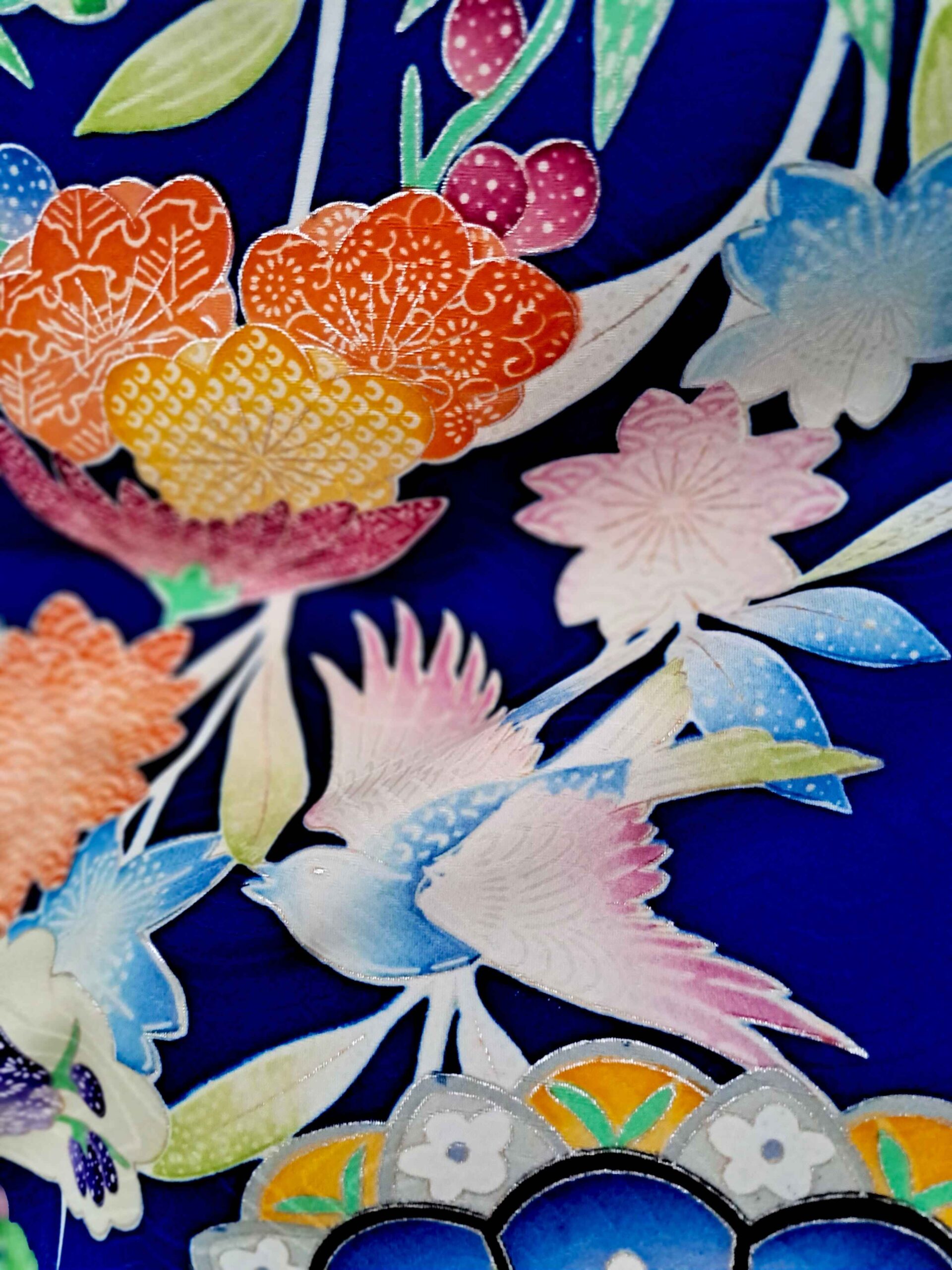 Against the backdrop of gracefully drooping cherry blossoms, this exquisite piece showcases vibrant canary yellow and vitamin orange flowers, evoking a tropical atmosphere through traditional Japanese dyeing techniques such as katazome and Edo komon. Meticulously crafted by skilled artisans, this luxurious garment is a masterpiece of craftsmanship.The design incorporates auspicious classical patterns, including “Seigaiha” pattern, which means ” happiness spreads out in an endless stream.”
