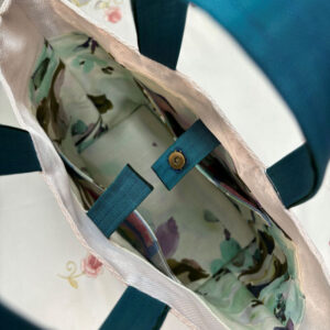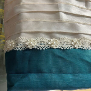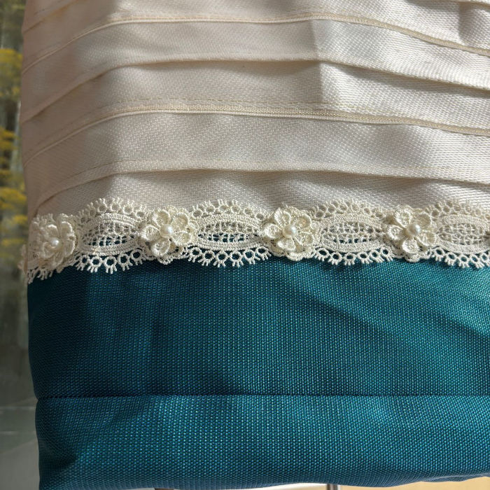 It is a stylish bag in white and blue with lace (very light, durable, and fashionable).