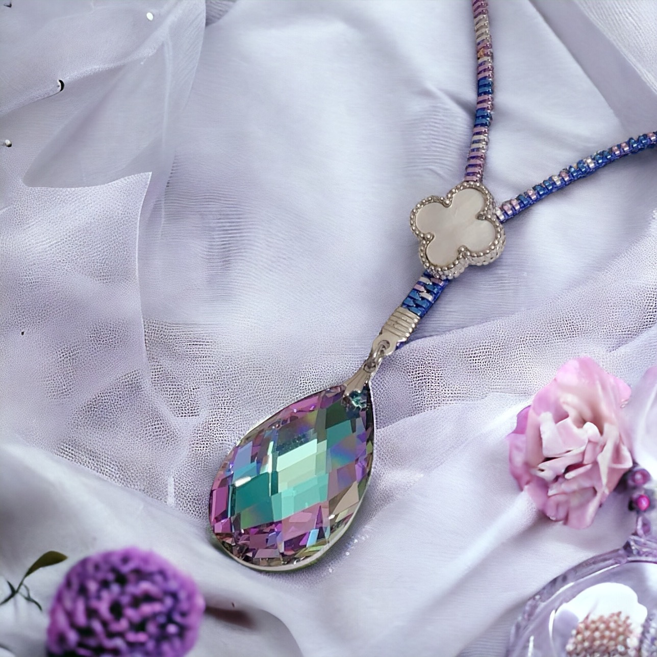 A stunning necklace featuring the brand’s original element color fastener in beautiful shades of blue, paired with a large Asfour crystal.